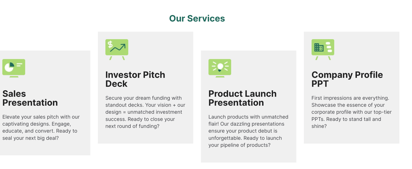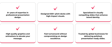 your audience. Whether it’s a corporate profile,investor pitch deck, or sales presentation, we’ve got you covered.